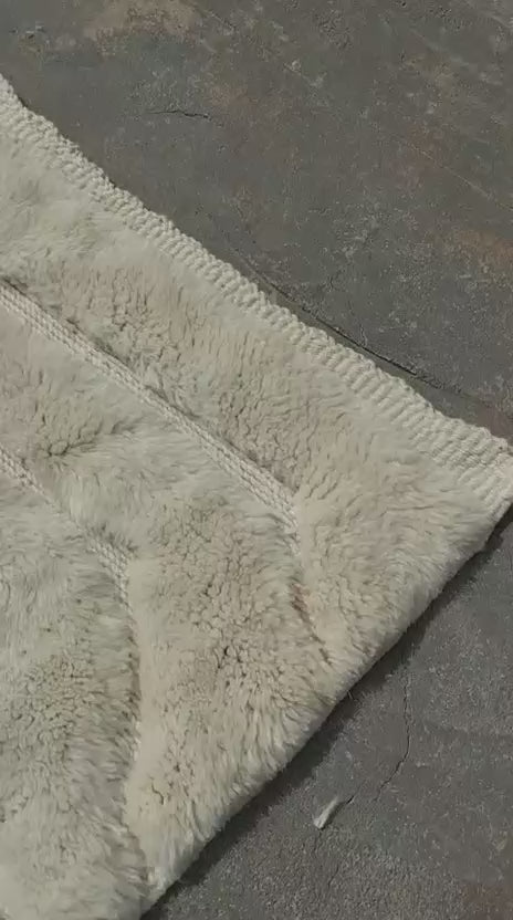 Découvrez le tapis luxueux de la tribu M'rirt, un chef-d'œuvre d'artisanat qui allie élégance et confort. Ce tapis, entièrement fabriqué à la main, présente  des lignes géométriques en blanc écru brodée sur une trame ton sur ton, qui apporte une touche moderne et raffinée à votre intérieur. Sa texture ultra soyeuse en laine pure de haute qualité fait de chaque pas une expérience de douceur et de chaleur.